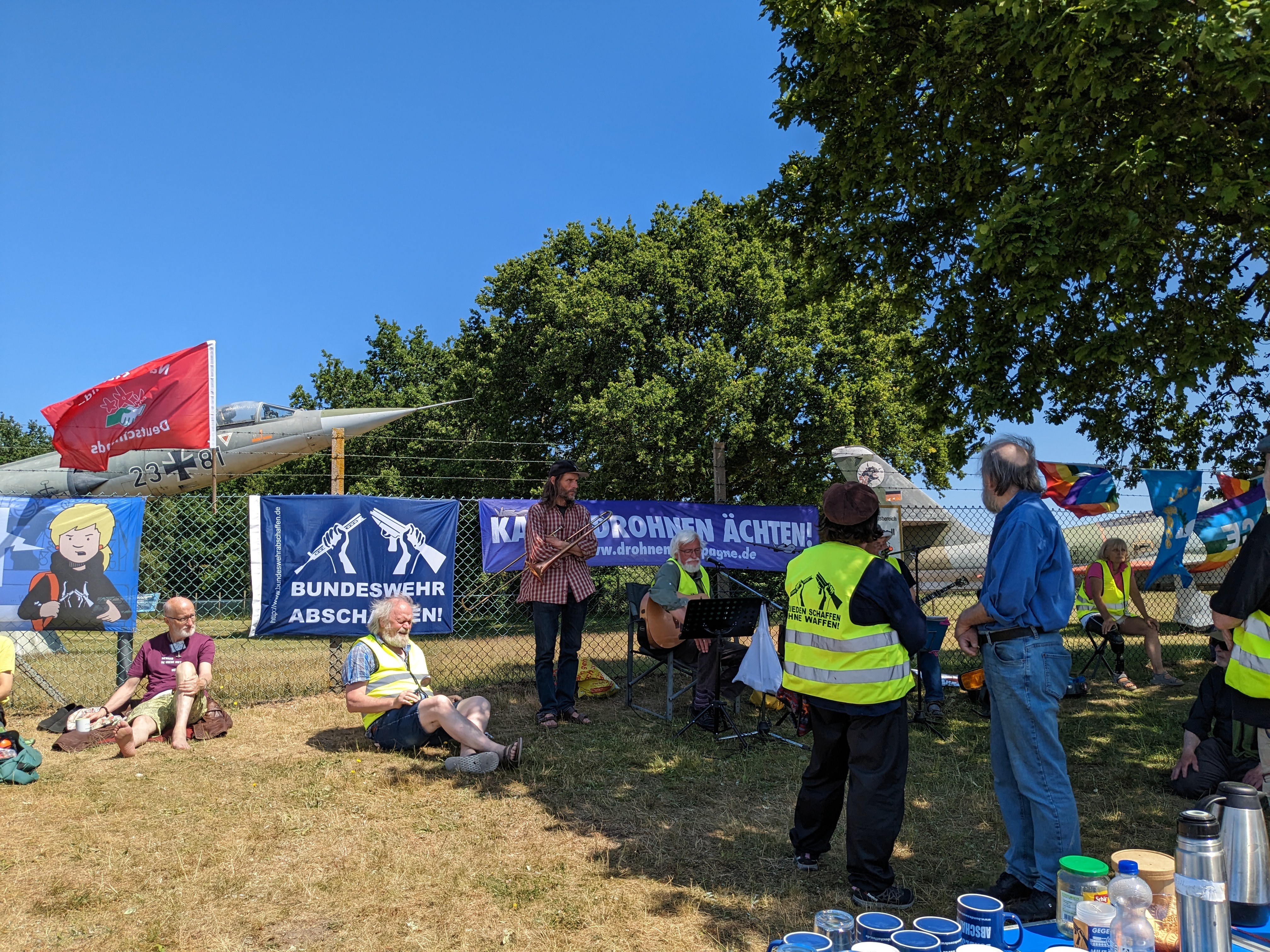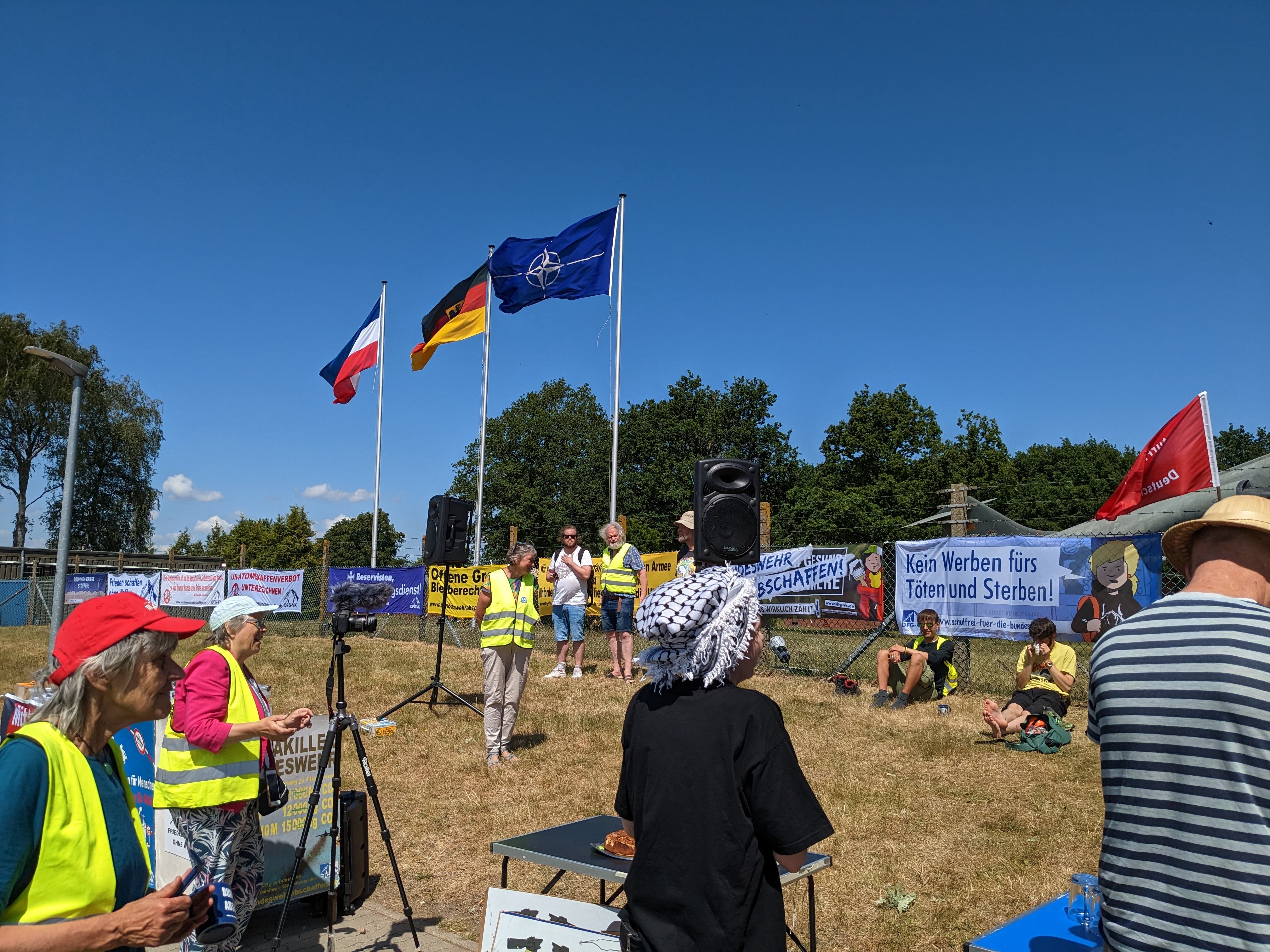Eine kleine Delegation des Friedensforums Neumünster nahm an der Mahnwache der DFG-VK in Jagel gegen das Luftwaffengroßmanöver der Nato "Air Defender 23" teil. Die Mahnwache war sehr gut vorbereitet. Was nicht überrascht, da es schon die 71. war in der langjährigen Reihe der Aktionen gegen den Militärstandort Jagel.