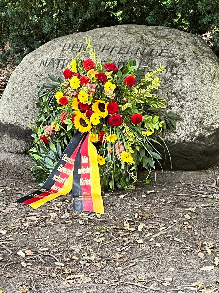 Schon um 15:30 Uhr legen GewerkschafterInnen einen Kranz am Gedenkstein in Rencks Park nieder.